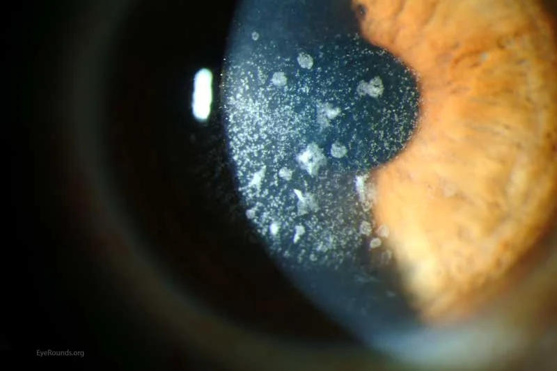 위의 사진처럼 각막에 흰색 혼탁(점)들이 생긴 것이 보이시나요? 이것들이 모두 아벨리노 각막 이영양증의 증상이며, 사람마다 매우 다양한 형태로 나타납니다.