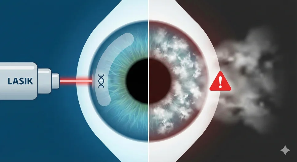 이 질환 유전자를 가진 분이 라식이나 라섹처럼 각막을 깎거나 상처를 내는 수술을 받게 되면, 병의 진행 속도가 급격히 빨라져 시력을 잃을 수도 있습니다. 그래서 수술 전 확인이 필수적인데요.
