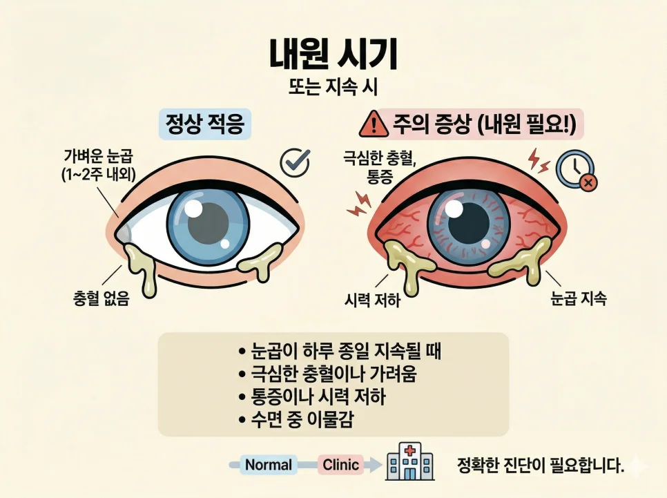 자연스러운 적응 과정: 하드렌즈 특유의 이물감에 눈이 적응하며 눈물이 나고 자극 반응으로 일시적인 눈곱이 생길 수 있습니다. 보통 1~2주 내외면 자연스럽게 사라지는 경우가 많습니다.