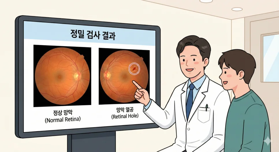 라식이나 라섹 수술 전에는 눈의 동공을 키워 안구 내부를 정밀하게 들여다보는 '산동 검사'를 필수적으로 진행합니다. 이 과정에서 망막 열공(구멍)이나 격자변성(망막이 얇아지는 현상) 등이 발견되면, 시력교정술 전에 먼저 치료를 권해드리는 경우가 있습니다.