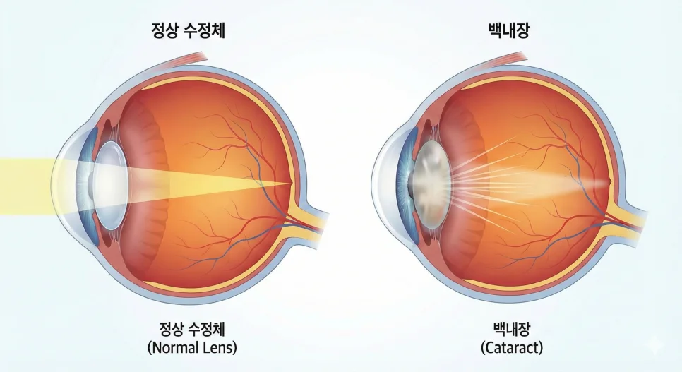 (▲ 맑은 정상 수정체 vs 혼탁해진 백내장 수정체)